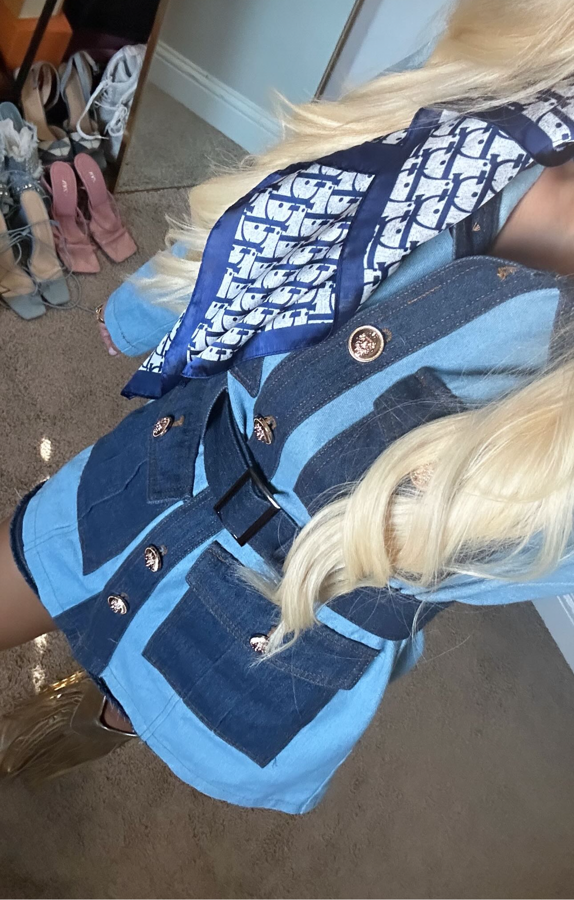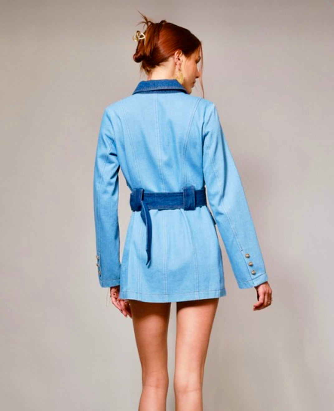 Expertly crafted with high-quality denim twill, this two-tone blazer dress features elegant flap pockets, gold-tone button detail, and a belted waist for a structured and flattering fit. Perfect for making a statement at any occasion!