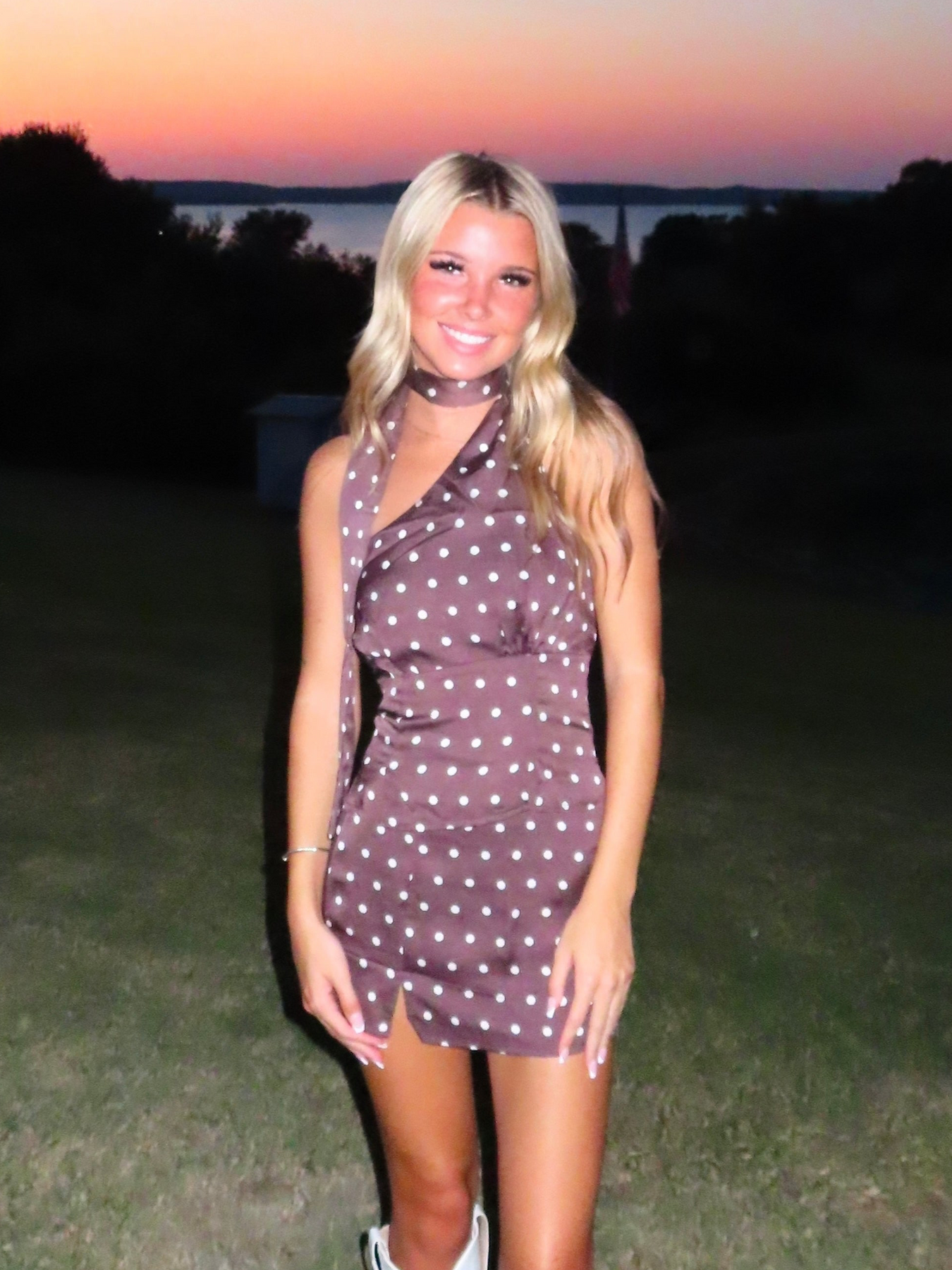 The print of the season! This set features a chocolate brown satin-like material with ivory polka dots. The top features a scarf neck halter detail, open back, and side zipper entrance. The matching mid-rise skirt is fully lined with a back zipper entrance. Perfect for a sophisticated, yet playful look & for all fall occasions!