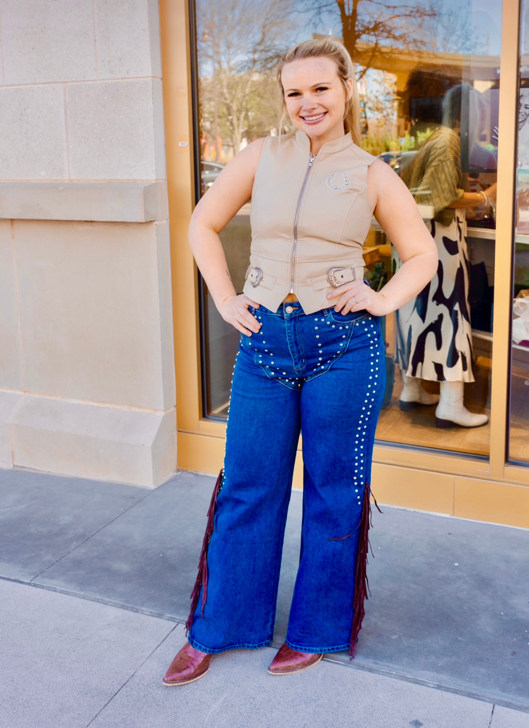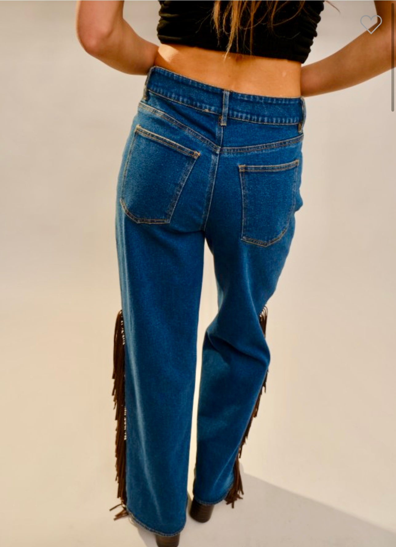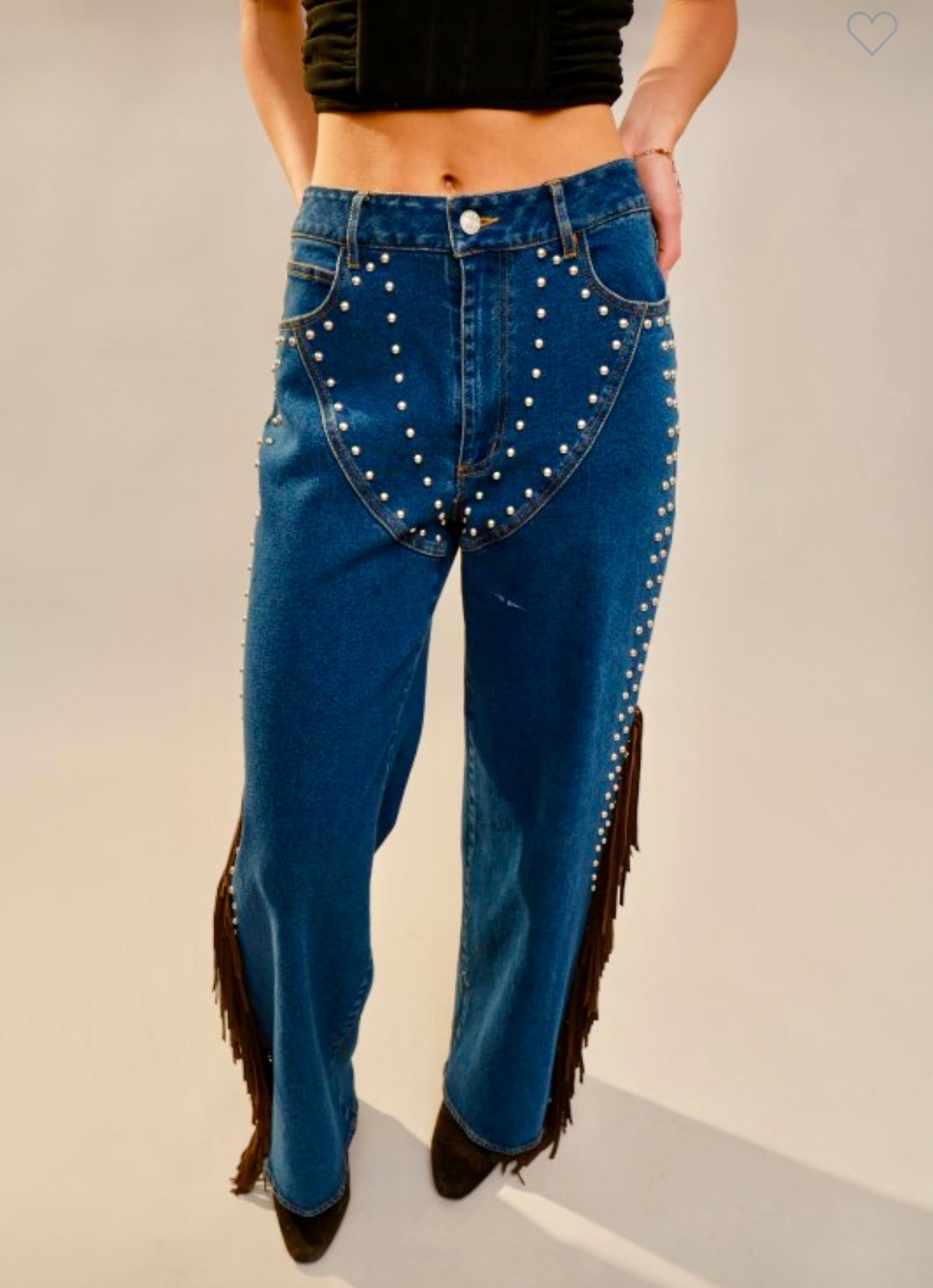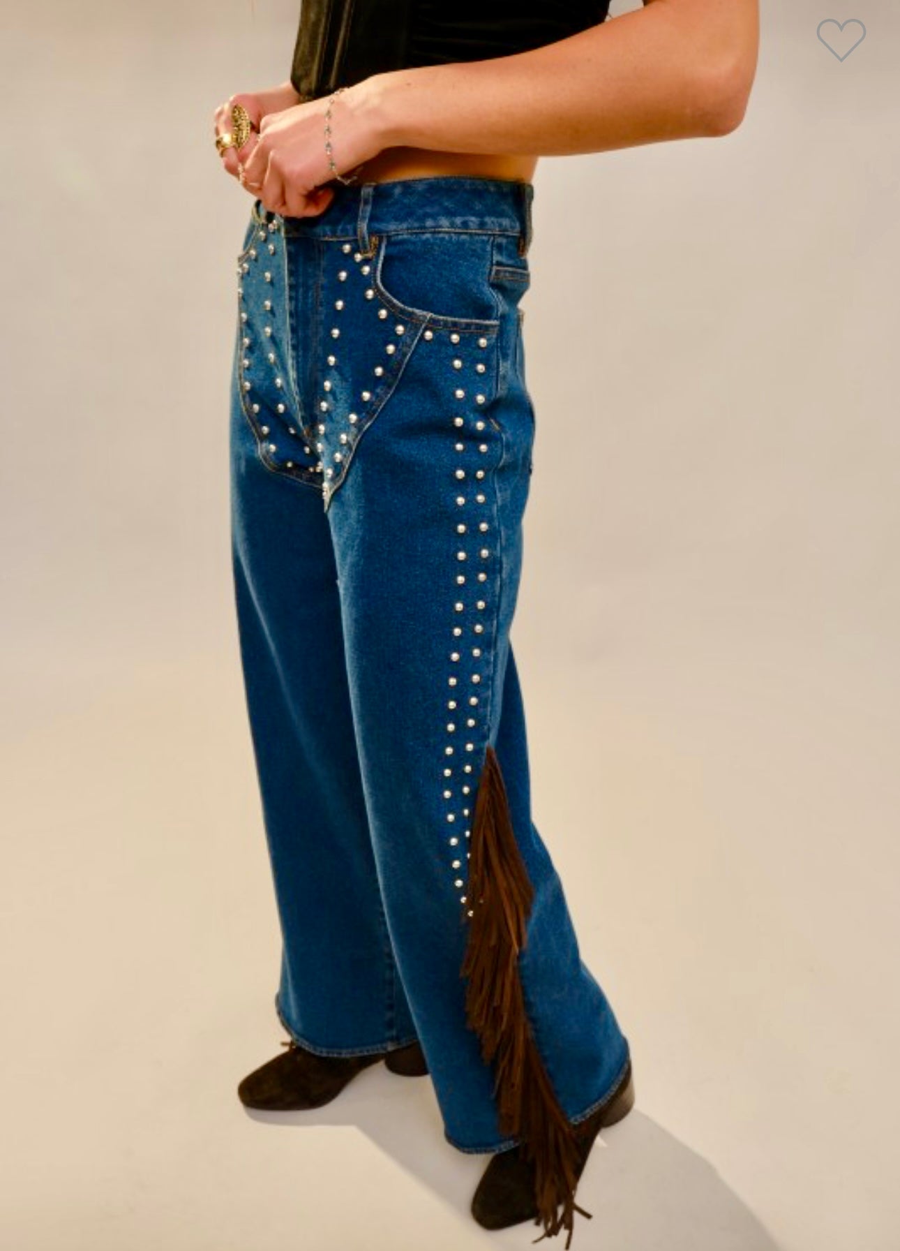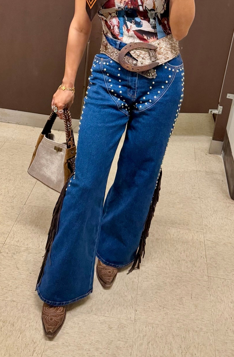 The perfect western denim! These Fringe Studded Denim Jeans feature a wide leg design with studded detailing along the front. Crafted from medium denim, featuring brown suede fringe detail along the sides. A Must have pair of western denim!
