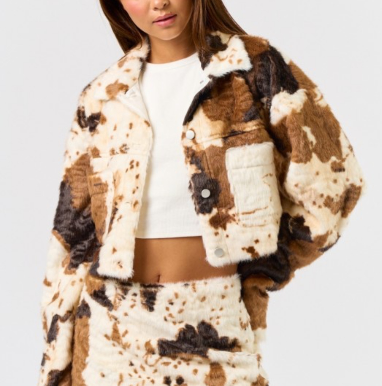 This Cowhide Crush Faux Fur Jacket effortlessly combines western charm and style with its cowhide design! Featuring a button down front, fully lined, with a collar & functional front pockets. Perfect for all rodeo events, this jacket adds a soft, feminine touch to any outfit. Pair it with denim or its matching skirt.
