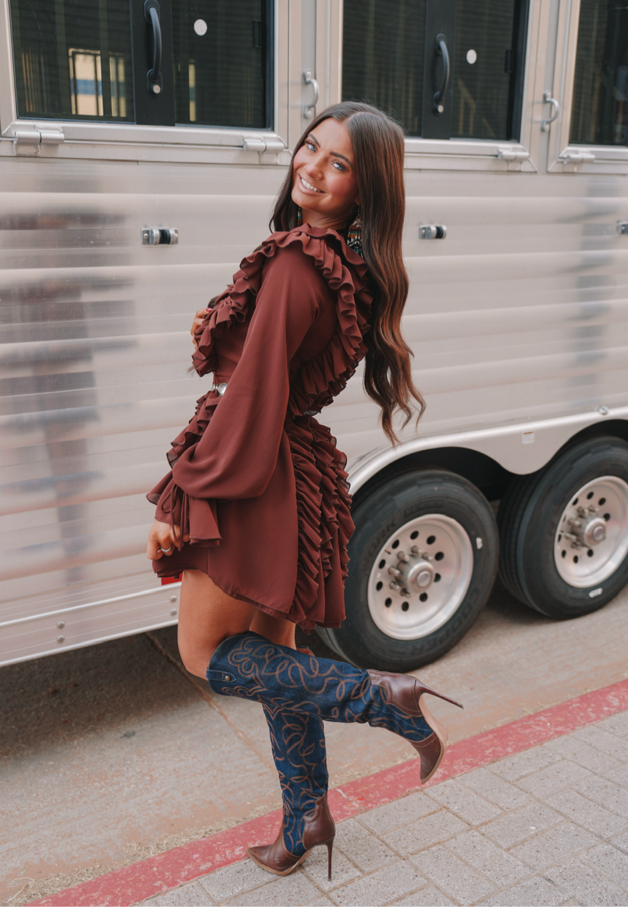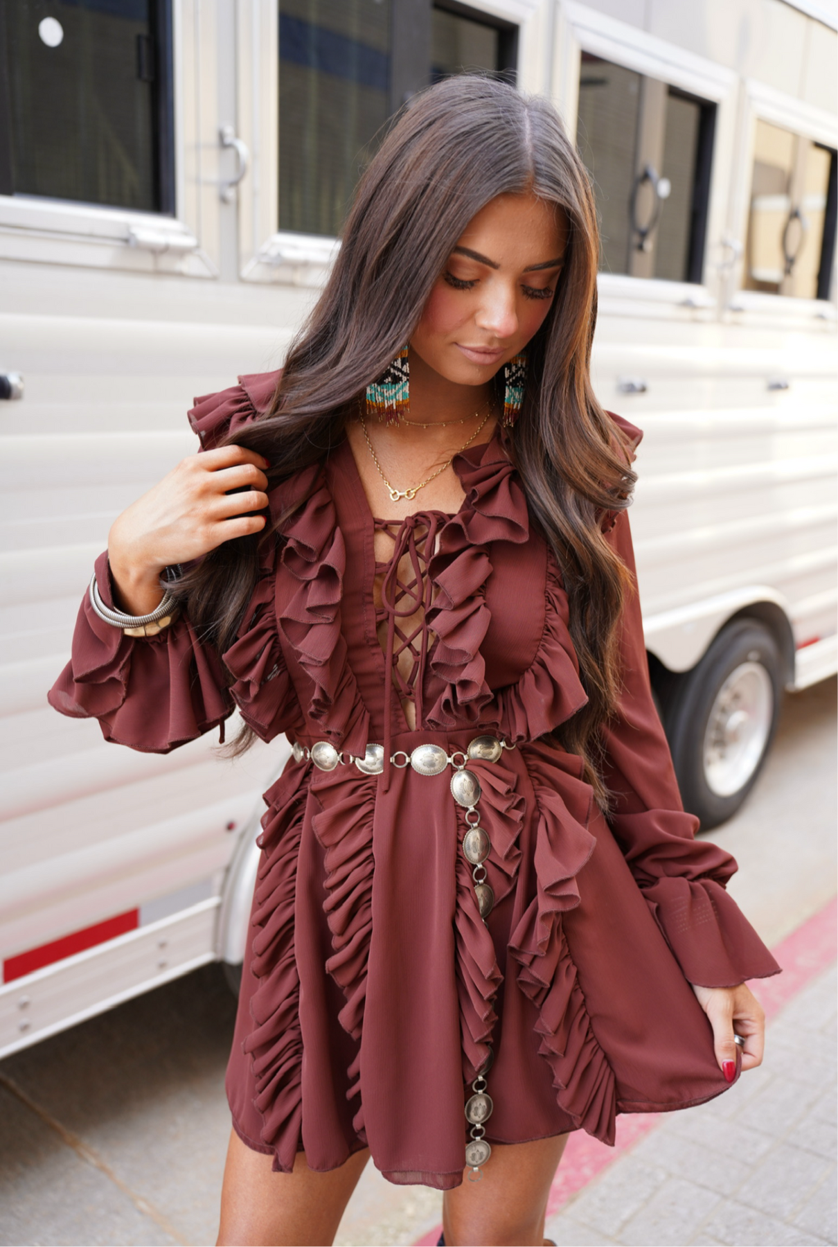 Elegance and femininity come together in the Fall Soiree Ruffle Mini Dress! Featuring a V-neckline with decorative bodice lacing and long flared frill sleeves, this dress exudes romance. The lightweight chiffon fabric and semi-sheer elements elevate the design, making it perfect for any special occasion. Crafted with a vintage-inspired silhouette and modern touch.